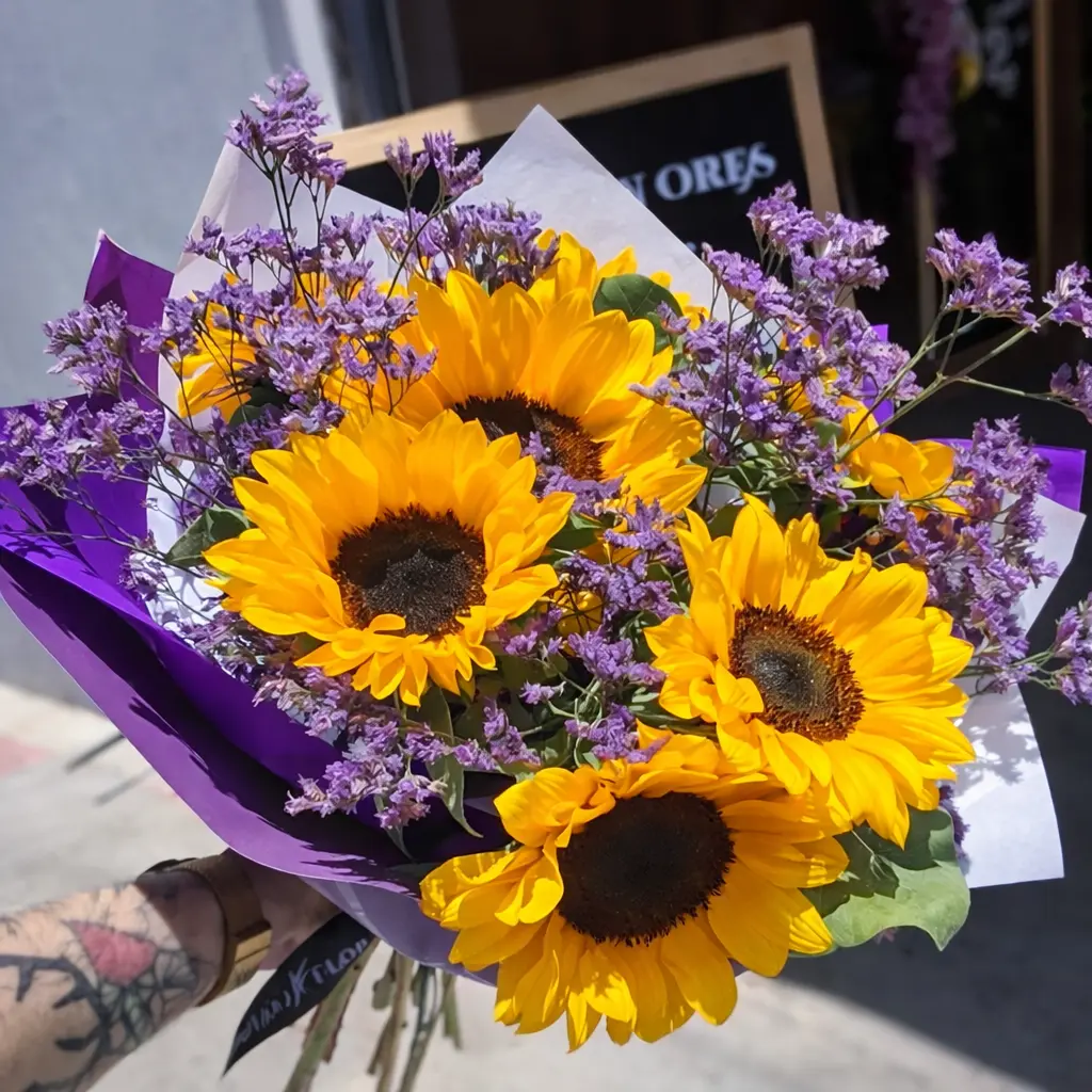 Tamaño M: Ramo de 5 girasoles, acompañados de limonium