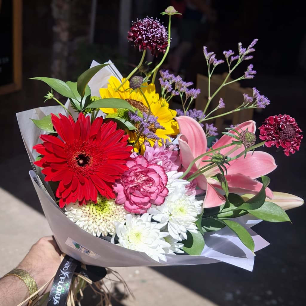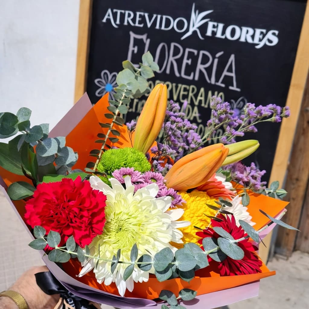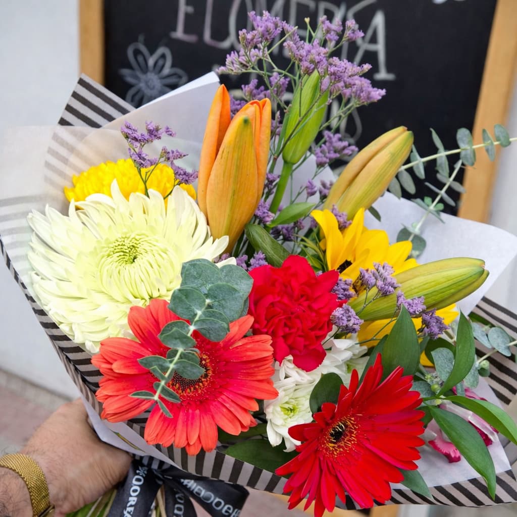 Ramo de 10 varas de flores mix de temporada, acompañadas de follajes verdes disponibles.